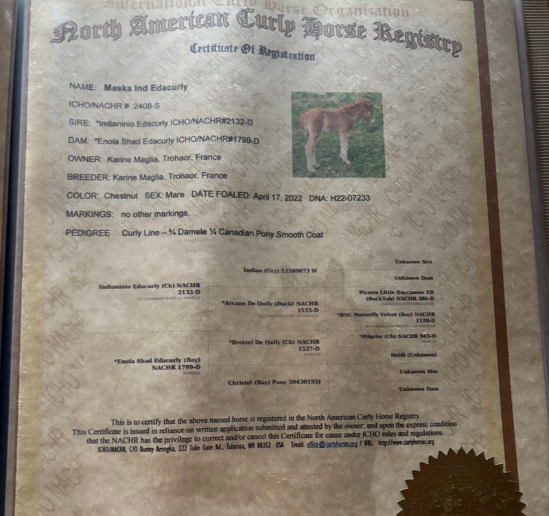 Père : Indianinio Edacurly CURLY. Mère : Alicante SHETLAND Lignée : canadian, Damele,